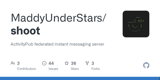 Teknevra@lemmy.worldEnglish · 17 days agoGitHub - MaddyUnderStars/shoot: ActivityPub federated instant messaging serverplus-squaregithub.comexternal-linkmessage-square9fedilinkarrow-up116