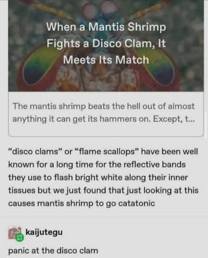 cm0002@suppo.fi · 19 hours agoWhen a mantis shrimp fights a disco clamsuppo.fiimagemessage-square20fedilinkarrow-up1341