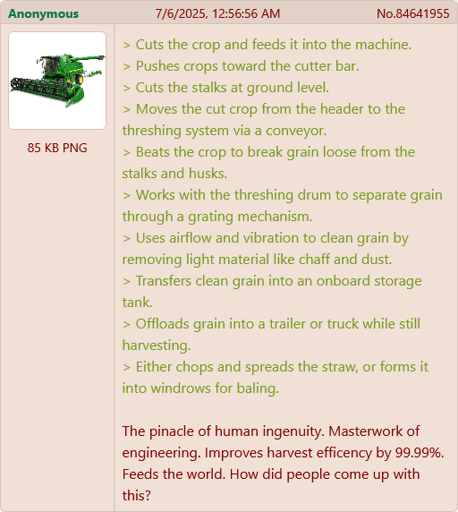 arrow-up1180imageI watched several videos on a Combine Harvester's inner workings and I still don't understand how this thing works.lemmy.mlPharmacokinetics@lemmy.worldEnglish · 5 months agomessage-square10fedilink