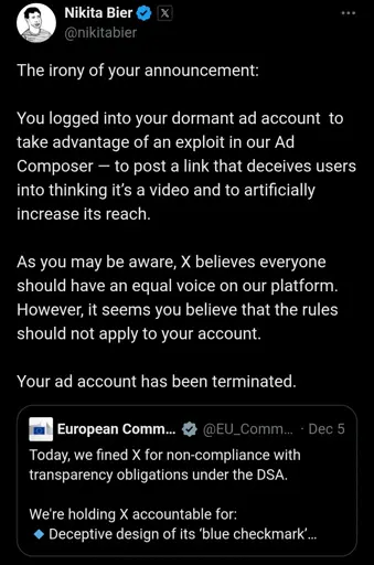 King@sh.itjust.works to Technology@lemmy.zipEnglish · edit-224 hours agoX terminates European Commission's ad account after €120 million finelemmy.zipimagemessage-square36fedilinkarrow-up1211file-text