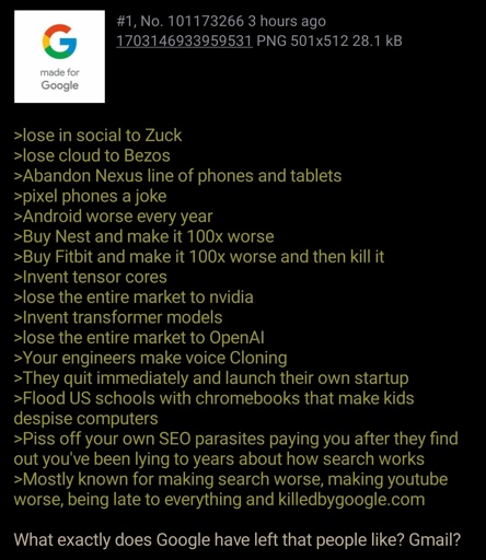 arrow-up11.21KimageAnon thinks about Googleprogramming.devstarman@programming.dev to > Greentext@lemmy.mlEnglish · 2 years agomessage-square343fedilink