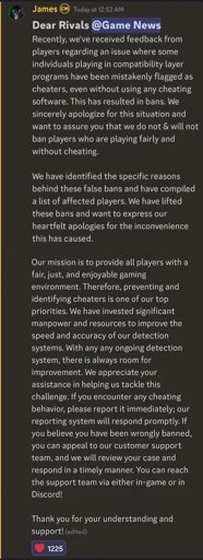 Dear Rivals @Game NewsRecently, we’ve received feedback fromplayers regarding an issue where someindividuals playing in compatibility layerprograms have been mistakenly flagged ascheaters, even without using any cheatingsoftware. This has resulted in bans. Wesincerely apologize for this situation andwant to assure you that we do not & will noban players who are playing fairly andwithout cheating.