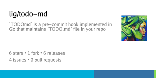 todo-md is a small pre-commit hook implemented in Bash that maintains TODO.md file in your repoHey! I’ve just released todo-md v1 🚀. Keep your tasks organized with todo-md!The pre-commit hook automatically maintains a TODO.md file by scanning your staged files for TODO: comments. You do not need complicated task trackers bloated with features anymore:) Let your code speak for itself!