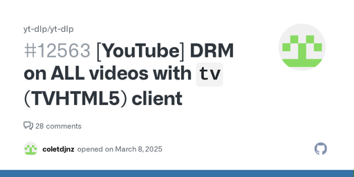 arrow-up151external-linkyt-dlp - YouTube DRM added on all videos with tv (TVHTML5) clientgithub.comcantankerous_cashew@lemmy.world to datahoarder@lemmy.ml · 8 months agomessage-square0fedilinkcross-posted to: technology@beehaw.orgpiracy@lemmy.dbzer0.com