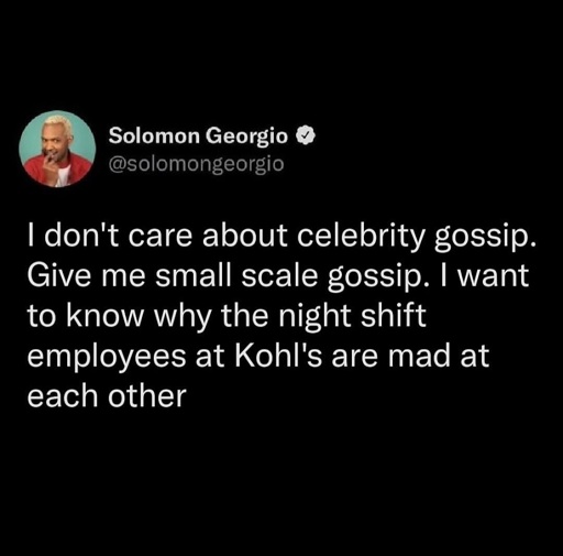 My ND ass has, to this day, never understood gossip. Whenever I hear about some petty squabbling between people I know, I stay as far away from it as possible. Why would people subject each other to the worst parts of other people that they’re not even remotely close with?