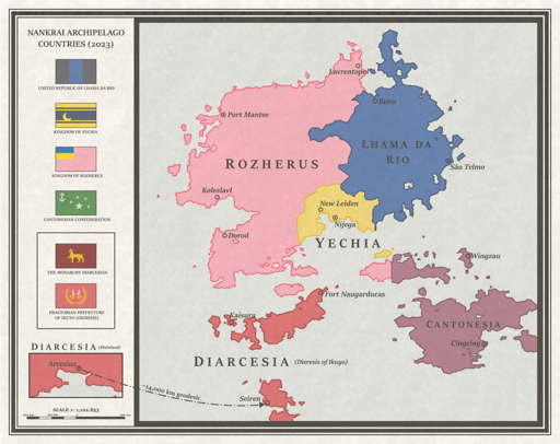 Diarcesia is a supranational monarchy (as in ruled by a leader titled “Monarch”) in a fictional planet which allowed its component country (called a “dieresis”) to secede. Diarcesia used to hold considerable influence in the Nankrai Archipelago and once held large parts of Rhozerus and Yechia.