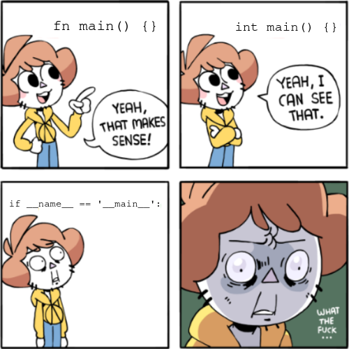 the main issue presented in the meme is that python is “weird” because it doesn’t have a default launch entrypoint like rust (I think) and c/c++. Both are compiled languages and python is generally not. When python is used in a compiled manner (wheels) however, it also does have a way to specify entrypoints, so the meme is comparing specifically compiled languages with interpreted scripting languages.