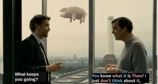 Image description: Still image of two characters with dialogue from the film “Children of Men (2006).” The two characters are at the “Arc of the Arts,” museum near a window where outside a large pig-shaped balloon is flying. The character on the left, Theo, asks “What keeps you going?” The character on the right replies. “You know what it is Theo? I just don’t think about it.” The words of their reply are colored in trans-flag blue, white and pink.