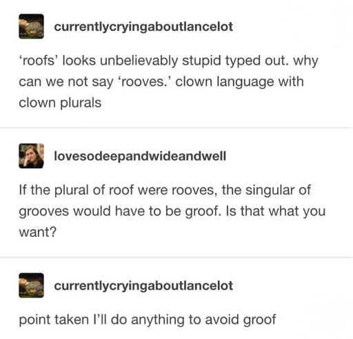 That is to say, if you unironically start saying “rooves”, I can’t say whether you’ll start a trend that will ultimately change English forever (weirder things have happened). But I can assure you that the immediate effect will be that people will label you “tumblr weirdo”. Which would be a correct assessment, so that’s effective subtextual communication. Yay linguistics!