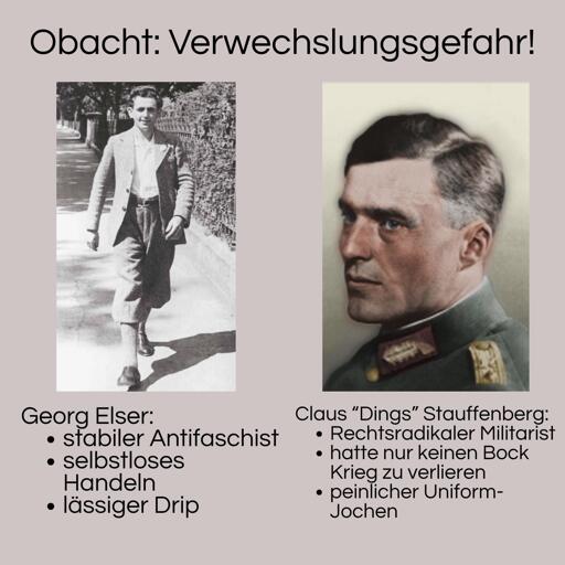 Dass das auf persönlicher Ebene immer noch jede Menge Mut erfordert hat, steht außer Frage. Das Meme ist eher ein Ausdruck an Frustration mit Mainstream-Heldenverehrung von Stauffenberg und seiner Gruppe die ideologisch doch stark bei den Interessen der alten Junkerklasse und Militärelite stand, während Georg Elser eher nur von Menschen mit zumindest etwas Enthusiasten-Interesse an Geschichte wirklich gekannt wird. Obwohl seine Geschichte aus meiner Sicht auch tatsächlich interessanter ist. (Ein Attentat auf Hitler planen, das knapp fehlschlägt, wenn man selbst in der Militärführung steckt ist mutig und interessant; Ein Attentat als Tischler ohne große Verbindungen planen, das auch nur knapp fehlschlägt, ist in meinen Augen halt tatsächlich Anerkennungswürdiger und interessanter.)