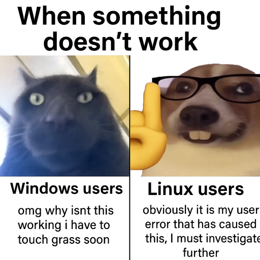 minus-squareoopsallnaps@piefed.calinkfedilinkEnglisharrow-up5·4 months agoAnd thats honestly why I enjoy Linux a lot more. The mistakes are my mistake…except for pageflip timed out.