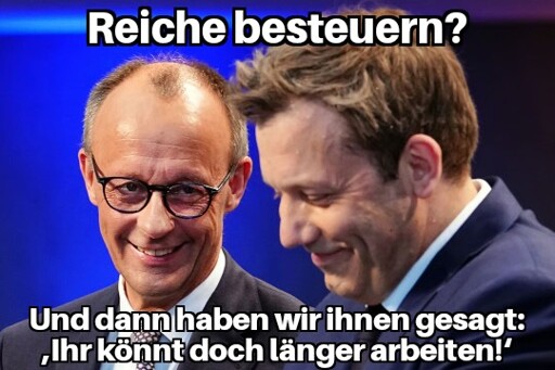 - Die CDU würde lieber Jens Spahn als das selbstgerechte Arschloch demaskieren, das er ist, als sich selbst die Reichensteuer aufzuerlegen. - Das kann sie gerne versuchen. Dann kann sie sehen, wie viele Stimmen sie nach 4 Jahre Merz und ohne eine einzige Antwort auf die ungerechte Verteilung bekommt. - Aber das muss wie eine Sau durch jedes Dorf gejagt werden, das wir haben.