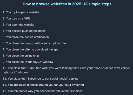 ☆ Yσɠƚԋσʂ ☆@lemmy.ml to Programmer Humor@lemmy.mlEnglish · 3 months agoHow to browse websites in 2025: 13 simple stepslemmy.mlimagemessage-square25fedilinkarrow-up1241cross-posted to: programmer_humor@programming.dev