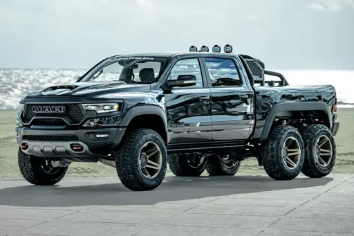 It’s an Apocalypse Warlord (lol) 6x6 and it can be yours for just $250,000. What they do is take a run of the mill Ram TRX which is already an expensive truck at $95,000 and lengthen it to add two wheels and flip the RAM badge backwards so it says WAR