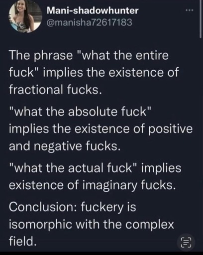 An “entire” fiction is analytic at all points on the complex plane, so by Liouville’s boundedness theorem, it is either constant or unbounded. I think we can agree that this fuck function isn’t constant, so it must be unbounded. It is also continuous, thus infinite.