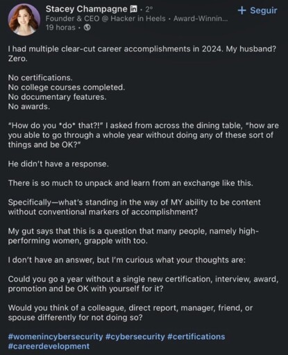 From linkedin, we can always assume it is humblebragging. But her line makes me wonder: “Specifically - Whats standing in the way of my ability to be content without conventional markers of accomplishment?” It could be the classic “oh i there is so much i have to learn because i have so much linkedin-self-awareness” Tartas has a point. She isnt shaming her husband.