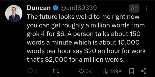Counterpoint: we can charge people $5 to undermine grok and just write “beanis” 2 million times. Think of the Hexbear earning potential!