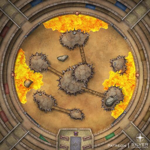 This Coliseum encounter features 8 phases which depict the arena slowly flooding with lava. Multiple platforms provide temporary safety, which the fighters can climb through ladders. Rickety bridges connect the platforms. The ultimate goal is to get to the centermost platform, which is the only place that does not get flooded. Only one fighter may stand there.
