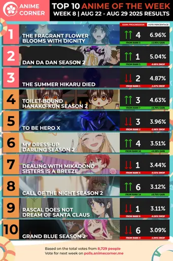 alphacyberranger@sh.itjust.works to Anime@ani.socialEnglish · 2 months agoTop 10 Anime of the Week #8 - Summer 2025 (Anime Corner)sh.itjust.worksimagemessage-square14fedilinkarrow-up147