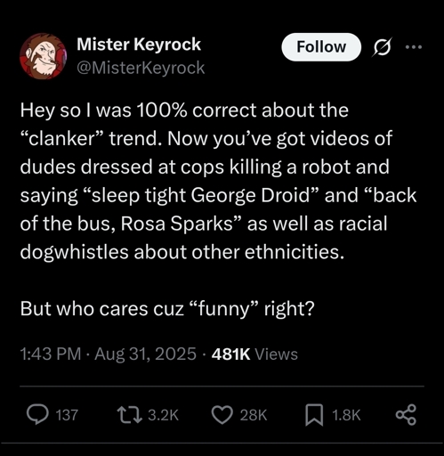 Hey so I was 100% correct about the “clanker” trend. Now you’ve got videos of dudes dressed at cops killing a robot and saying “sleep tight George Droid” and “back of the bus, Rosa Sparks” as well as racial dogwhistles about other ethnicities.