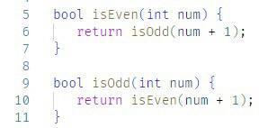 isEven(0) -> true; isEven(Num) -> isOdd(Num-1). isOdd(0) -> false; isOdd(Num) -> isEven(Num-1).