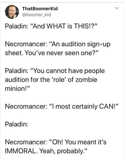 and because it’s good free PR, the necromantic thralls get to visit their family (or just pen letters if on campaign) during downtime.They’re not empathetic or anything, they just don’t have any desire to actively harm normal people and recognize that being at least mostly tolerated makes everything easier.