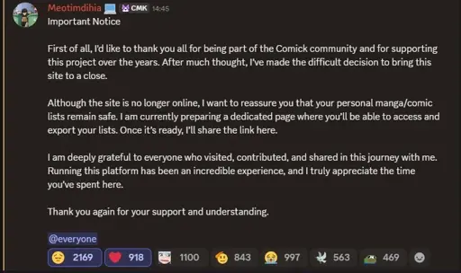 arrow-up178image[STATUS] Comick.io closes down.ani.socialPrincessKadath@ani.socialM to Manga@ani.socialEnglish · 1 month agomessage-square54fedilink