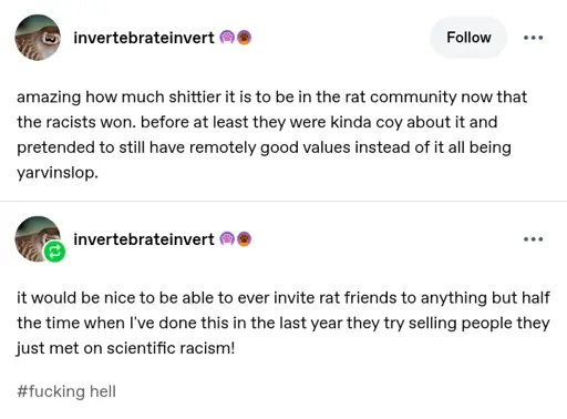 amazing how much shittier it is to be in the rat community now that the racists won. before at least they were kinda coy about it and pretended to still have remotely good values instead of it all being yarvinslop.