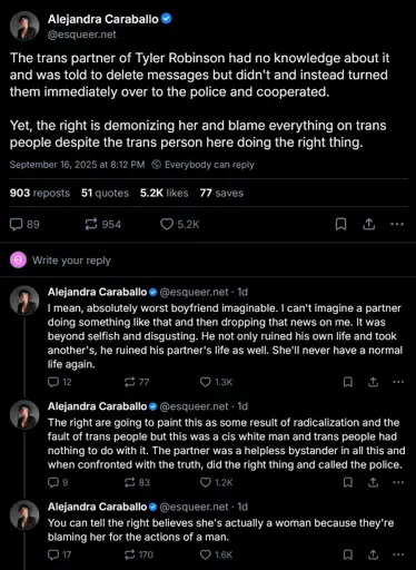 The trans partner of Tyler Robinson had no knowledge about it and was told to delete messages but didn’t and instead turned them immediately over to the police and cooperated. Yet, the right is demonizing her and blame everything on trans people despite the trans person here doing the right thing.
