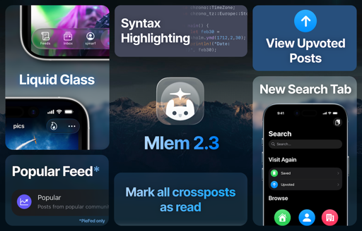 Mlem 2.3 is now available on the App Store, featuring a new design with Liquid Glass, improved PieFed support, and several smaller features and bug fixes.