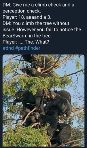 minus-squareCeruleanRuin@lemmings.worldlinkfedilinkEnglisharrow-up5·24 days agoDM: Oh whoops, misread my own writing. That should be “bears, warm in the tree.” Player: That’s not much better.