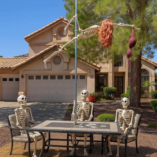 The image could have been a comic version of the same “strip joint skeleton Halloween decoration” and still been funny, but the idea of someone actually putting in the effort to build it in their yard adds to the humor. For me, the generation is almost good enough to look real at a quick glance, but the sense of something being off and subsequent realization that I’ve been “fooled” into thinking it was a real photo kills that humor and leaves a sour feeling.
