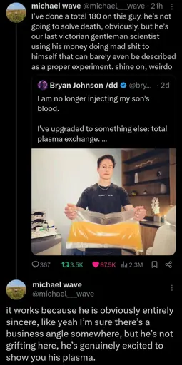 This guy is kind of a grifter but on one hand he at least is authentic to his grift so I get what they’re saying. Like the conservatives that cause grindr to crash during Charlie Kirk’s funeral are just so frustrating but I truly believe this guy literally eats this shit day in and day out and actually does the vampire shit. I don’t think it’ll work, if he does live longer I think it will be because he’s fucking rich as shit and that seems to be real beneficial to outcomes as you have access to excellent medical care including preventative care and the ability to be like “oh something’s bothering me, I need to push that meeting to get this looked at” and get a Dr immediately whereas us peons can’t get a Dr appt for 4 months and when we can it conflicts with work