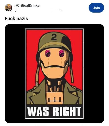 Yuritopiaposadism [none/use name]@hexbear.net to Chapotraphouse@hexbear.netEnglish · 8 days agoThey deleted the post and banned the user. Saying "fuck nazis" is not allowed on the critical drinker subreddithexbear.netimagemessage-square29fedilinkarrow-up1142file-text