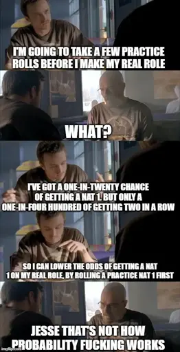 Right but the way I took the meme was that you would roll until you get a 1, then deciding the next roll is the “real” one.