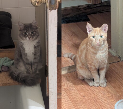 These are two feral cats that live inside our house. They have full ability to go outside whenever they want but they decide to live in the house. We are not allowed to touch them. But they have to look at me when I go to the bathroom.
