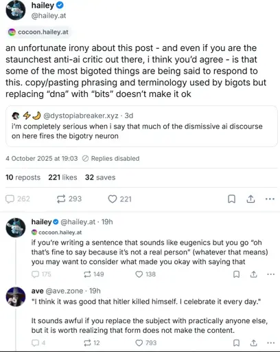 irelephant [he/him]@lemmy.dbzer0.com to TechTakes@awful.systemsEnglish · 30 days ago"Anti-ai arguments literally support eugenics"locklemmy.dbzer0.comimagemessage-square89fedilinkarrow-up1237file-text