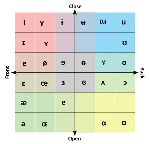 IPA vowel chart with political compass meme colors to make it more cursed, but also yeah that’s probably the name of Elon’s next child