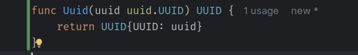 interface you have set up. It’s a common pattern in go to create a thin wrapper around an imported type so you can implement all the methods required for some interface you defined. It does make naming those thin wrappers hard because what are you supposed to name the struct that just contains a uuid?Yep, that person would be me and that’s exactly what I was doing, just found it funny that there was so many uuids in the piece of code.