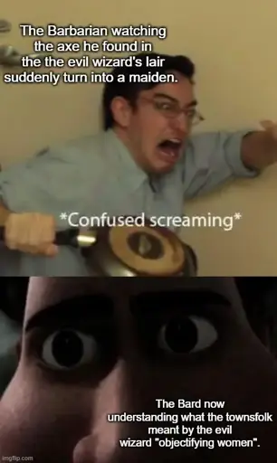 With no other options, she asks to join the party. Her only move is to launch herself directly at the enemy, causing the barbarian to declare her a kindred spirit and fall madly in love with her.