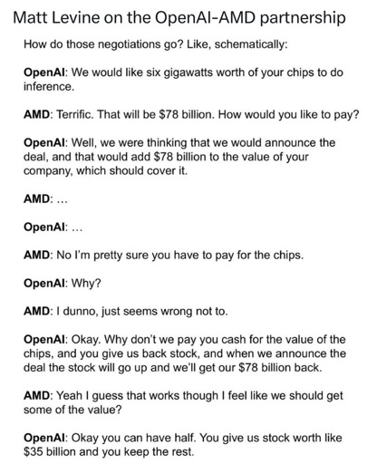 That’s the bet-swap. They have both have a contractual obligation to exchange investments in each other. It’s a suicide pact OR it’s a bromance glow-up, depending on your point of view. AMD is giving them chips on the (accurate so far) bet that buying chips will inflate AMD’s stock value.