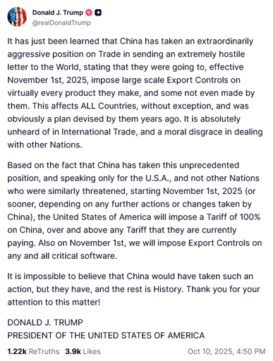 Trump imposes new additional 100% tariff on China, starting November 1