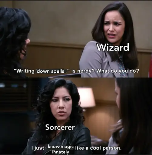 minus-squareSwedneck@discuss.tchncs.delinkfedilinkarrow-up1·3 days agowizard who turns into a sorcerer after chugging 15 clarity potions in a row to cram their studies in a single night they are no longer able to sleep, are constantly slightly tired and jumpy, and will reflexively cast cantrips when startled.