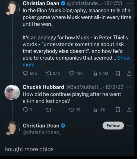 Exactly. There’s rich people that’d be nearly doomed if they made a big enough fuck up. For the wealthy, there almost isn’t a big enough fuck up to make. Even buying Twitter and running it into the ground, he’s still the richest man in the world. It’s insane.