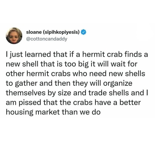 So a less powerful crab cannot take full advantage of the shell, but recognizes its value to larger more powerful crabs. This is also an argument for scalping. If you find an expensive console or GPU which you can’t afford long term, but you know you could carry the debt temporarily, you could buy it yourself then sell it to someone else later who could afford long term and you would personally pocket the profit. It could be argued that thats what the original-large-shell-finding small crab here is doing: scalping.