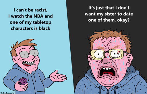[dude speaking proudly, holding a d20] I can’t be racist, I watch the NBA and one of my tabletop characters is black