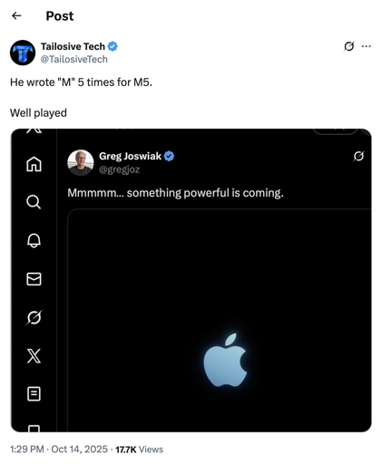 mudkip@lemdro.id to Apple@lemmy.mlEnglish · 2 days agoApple employee Greg Joswiak teases M5 chiplemmy.mlimagemessage-square3fedilinkarrow-up11file-textcross-posted to: apple@lemdro.id