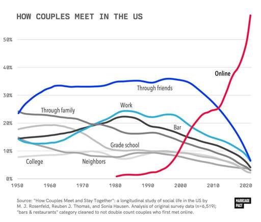 I think there are many valid criticisms of online dating, I would not suggest it’s an unalloyed good thing. However, I am old enough to have plenty of experience (trying to) date when online wasn’t an option (limited only to work, through friends, and through church since I was religious when I was younger) and I have to say, I prefer having the online option - or at least I did before I married my wife, who I met online.