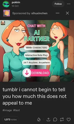 We are literally destroying our planet and the water ww drink to feed AIs, not to help us cure all diseases, educate our population, help us develop clean way to power our present and our future, but to wank to Louis Griffin. Literally something many of us have been able to do quite succesfully for many years without the assistance of AI.