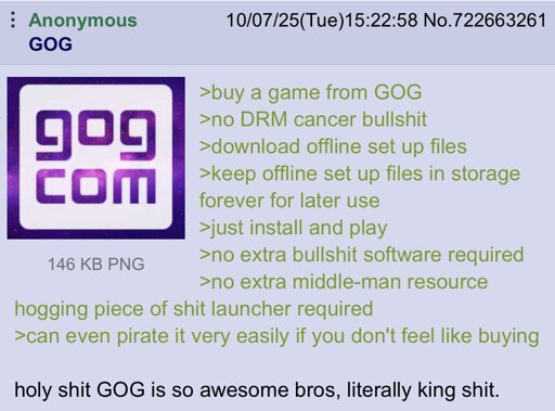 I didn’t start using GOG until I got a slap in the face with reality that I don’t own my games. I was ignorant and complacent back in the day when App Store purchases on Apple’s platform disappeared or I couldn’t download them again. “That sucks. Oh well. Damn.” is what I used to always say to myself over a decade ago. Funny that it took a beloved game - parts of it anyway - to where it finally sunk in how important digital ownership is.